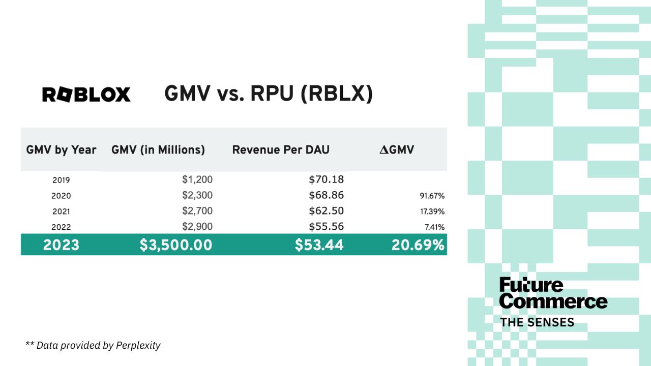 👾Roblox has 79 million daily active users, who collectively account for ~$53 of annual bookings (Roblox earnings call-speak for GMV). This is almost entirely digital currency purchases (called Robux) that are spent on digital items for in-game use.