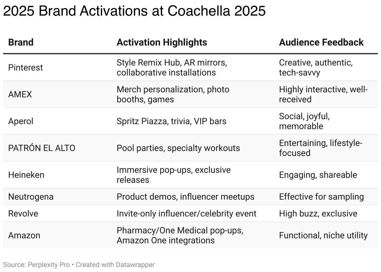 Aperol, American Express, Neutrogena, and Pinterest have gone all-in on creating on-site activations and lounges where visitors could cool off, relax, capture social content and test products. But with these spaces come capacity limits, which is why AMEX has limited its experience to card users, a tactic that not only creates an air of exclusivity but reaffirms the benefits of membership. Arguably, Pinterest was the only brand to truly double down on accessing, marketing that bringing everyday music fans in was key to the experience.
