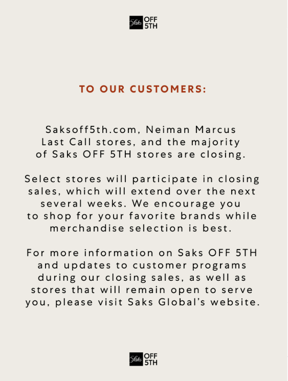 Speaking of sad days, shoppers have been hit with messages from Saks OFF 5th and Neiman Marcus Last Call that their operations are winding down as mega sales roll out. Only 12 of 74 Saks OFF 5th and Last Call stores will remain open to sell residual merchandise. But itâs not just consumers reaping the benefits; other merchants can swoop in to snatch up all the new leases hitting the market. Saksoff5th.com will also cease operations.