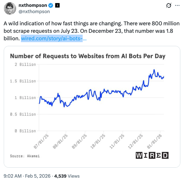 âThe Bots Are Hungry. New reports from Akamai and WIRED show that AI bots now make up a meaningful share of web traffic, and numbers will only continue to rise. Training-related bot traffic, in particular, is increasing as chatbots and AI tools retrieve real-time information (from inventory levels to flight rates) to improve their outputs. Another study from TollBit found that one in 31 visits to its customersâ sites in Q4 was from an AI scraping bot.Â