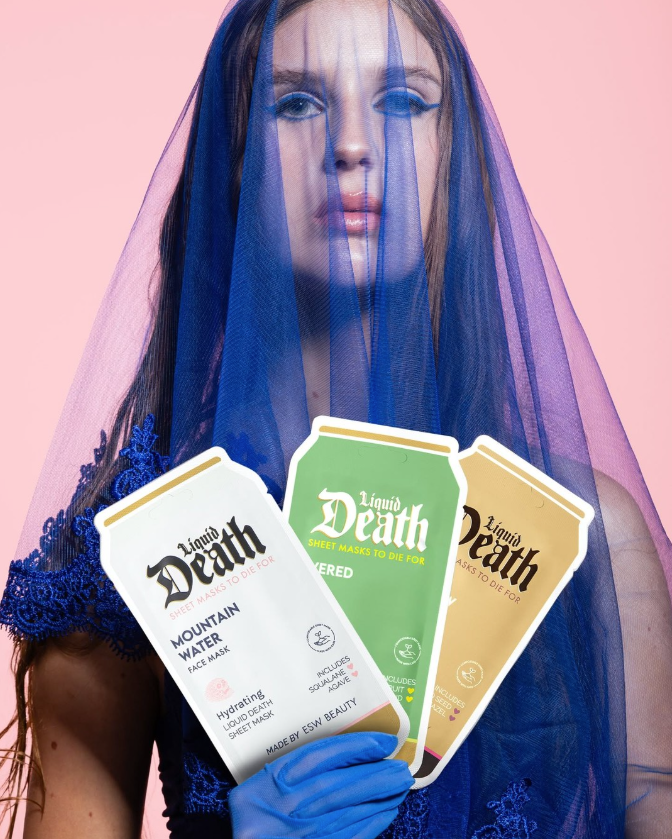 âRIP to Dry Skin. Liquid Death, the canned water company that turned into an entertainment powerhouse, has announced its latest product drop with ESW Beauty. A clever follow-up to its sold-out collection with E.l.f. Cosmetics, Liquid Death has partnered with ESW to sell a collection of facial sheet masks. Retailing for $17.99, the box set offers hydrating, revitalizing, and blemish-control masks, giving new audiences (especially Gen Z and Gen Alpha) a compelling entry point to the water brand as it expands into new flavors and categories like energy drinks.Â