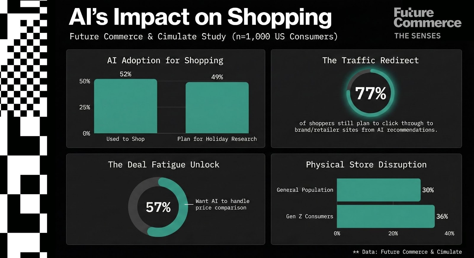 Nearly 70% of consumers already use generative AI platforms regularly, 52% have used it to shop, and 49% plan to start AI-assisted gift research this holiday season. AI has evolved from a novelty to a habitual tool.