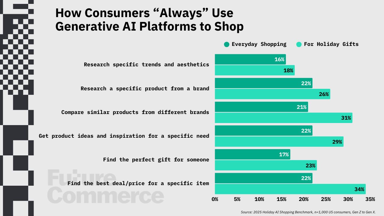 As promised, we officially dropped the first phase of our 2025 Holiday AI Shopping Benchmark, a survey of 1,000 US consumers from Gen Z to Gen X. Developed in partnership with Cimulate, this two-part analysis delves into consumers' intent to use generative AI platforms to shop for gifts, and how their experiences will shape actual preferences and future behaviors.Â