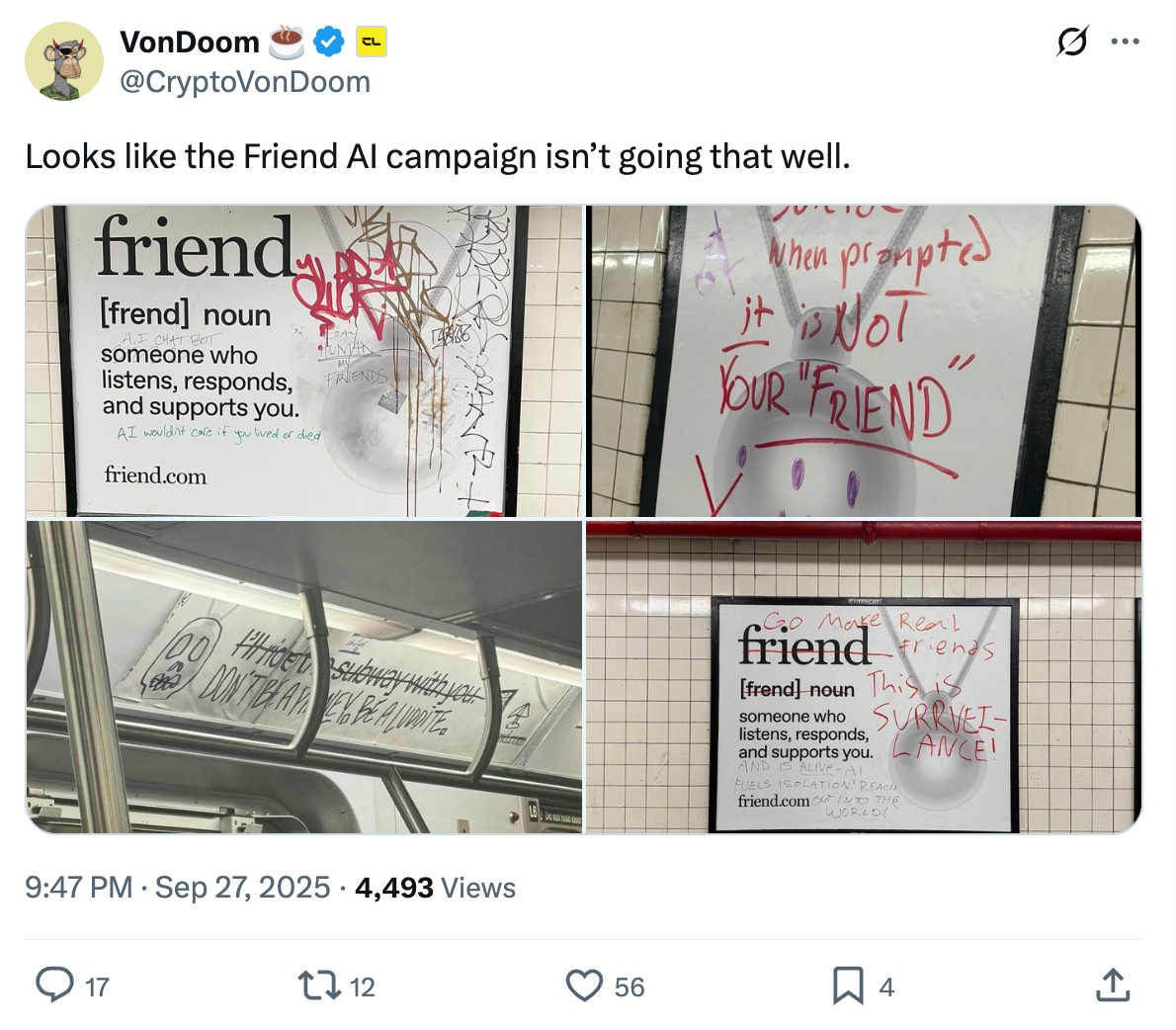 ‍Friend's $1M Subway Takeover Gets the Multiplayer Treatment. The launch of AI startup Friend has led to the largest subway campaign ever. In fact, what started as a single-channel brand initiative has transformed into one of the most robust examples of multiplayer culture. Not only have New Yorkers publicly contributed to the ads through good-old-fashioned vandalism, but someone (@marcgmbh on X) has created a digital experience that allows you to interact with the campaign online.Â